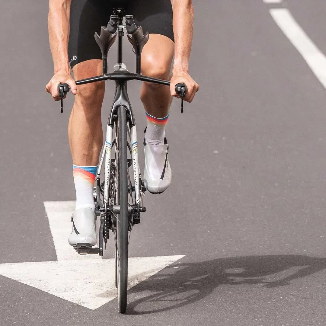 A lower sole platform reduces calf strain during the bike leg. A rigid CarbonShell™ sole supports the entire foot, eliminating energy loss from flex in conventional shoes. The muscles you save are the muscles you need most for the run. This isn't marketing — it's biomechanics. → Read the science